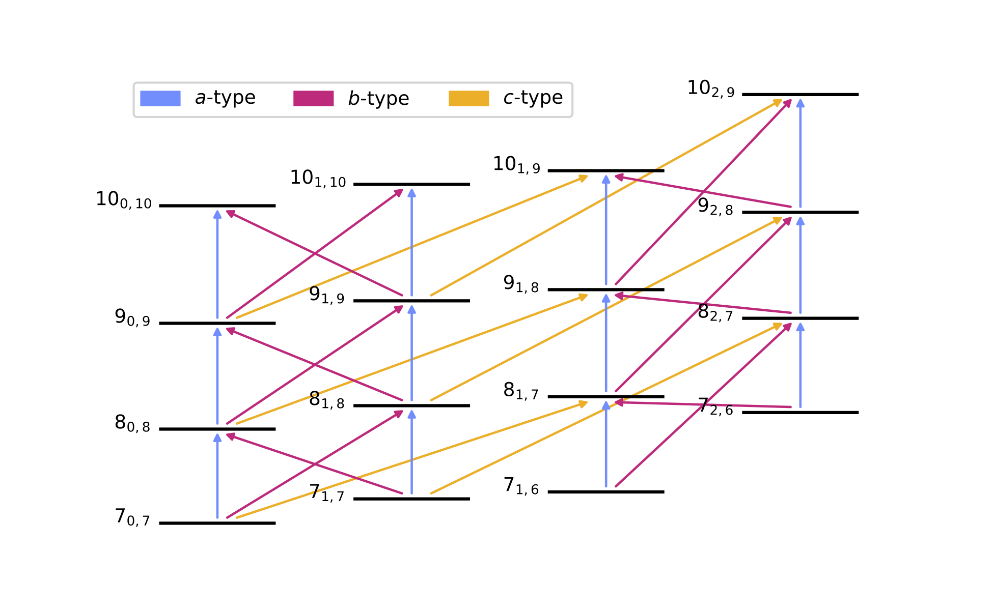 Every non-zero dipole moment component is responsible for a set of transitions with a set of selection rules. Accordingly, the designation is $a$-, $b$- and $c$-type transitions, with the corresponding component of the dipole moment being non-zero. \newline $a$-type transitions follow the selection rules $$ \begin{align} \Delta K_{a}&= 0 \ (\pm2, \pm4,...) \\ \Delta K_{c}&=\pm1 \ (\pm3, \pm 5,...) \end{align} $$ $b$-type transitions follow the selection rules $$ \begin{align} \Delta K_{a}&=\pm1 \ (\pm3, \pm 5,...) \\ \Delta K_{c}&=\pm1 \ (\pm3, \pm 5,...) \end{align} $$ $c$-type transitions follow the selection rules $$ \begin{align} \Delta K_{a}&=\pm1 \ (\pm3, \pm5,...) \\ \Delta K_{c}&=0 \ (\pm2, \pm 4,...) \end{align} $$ Values in brackets indicate, that these values are possible but less likely than the first value. The different transition types are shown in the following figure.