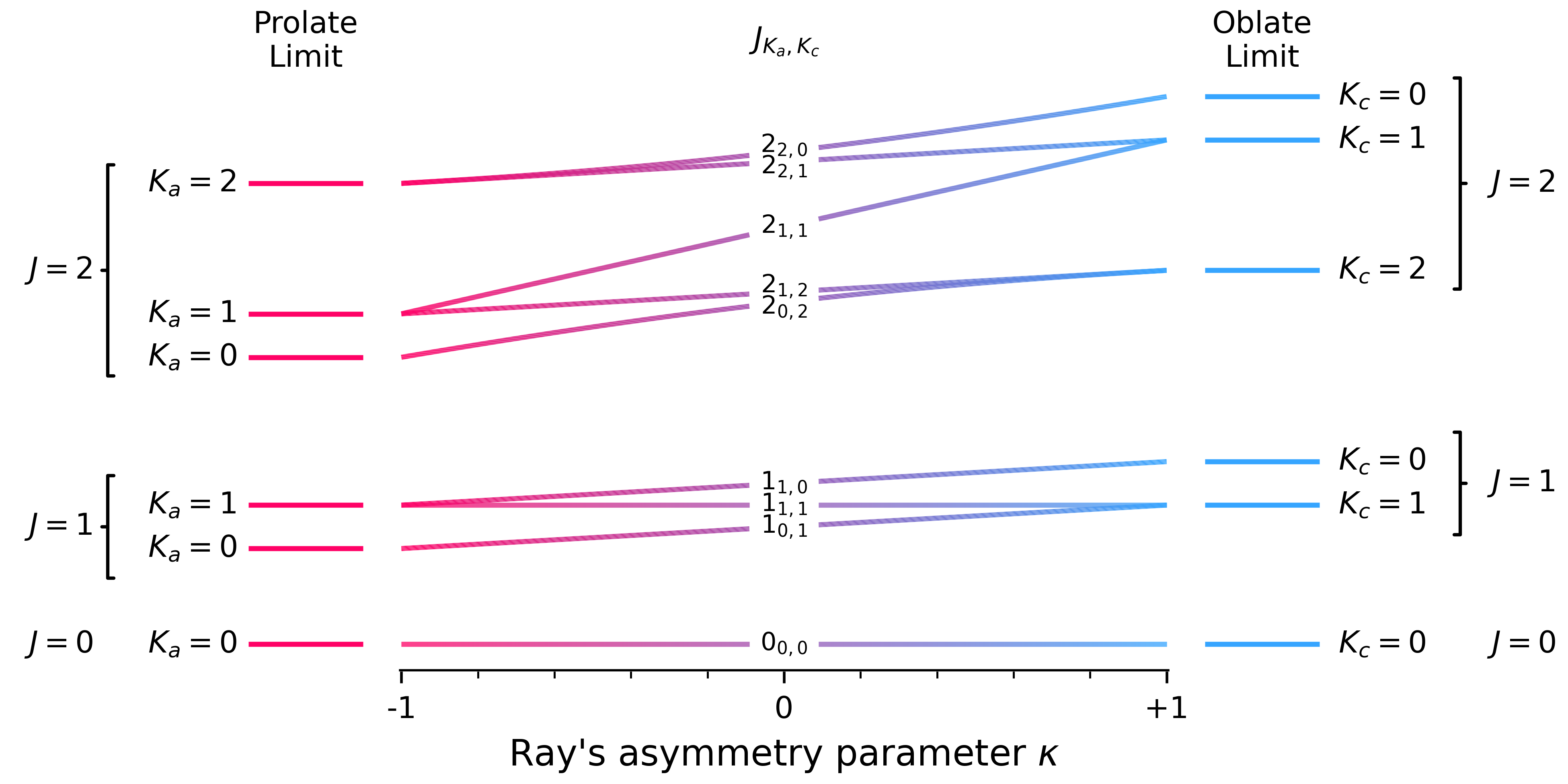 The process is explained here for $J=1$, as this case can be solved analytically. A total of three states has to be considered due to the $2J + 1$ different values of $K$, which is the projection quantum number of $J$ on the molecular $z$-axis. The states are written, as in the identities above, in the format $|J,K\rangle$. The system is then described with the following matrix $$ \begin{equation} \mathbf{H}/h = \begin{pmatrix} C+\frac{A+B}{2} & 0 & \frac{A-B}{2} \\ 0 & A+B & 0 \\ \frac{A-B}{2} & 0 & C+\frac{A+B}{2} \\ \end{pmatrix} \end{equation} $$ The energy values are found as the eigenvalues of the matrix $$ \begin{align} \lambda_{1} &= A+B \\ \lambda_{2} &= A+C \\ \lambda_{3} &= B+C \end{align} $$ To label the corresponding states the correlation diagram of prolate and oblate symmetric tops is introduced and Ray's asymmetry parameter $$ \kappa = \frac{2B-A-C}{A-C} $$ is used.