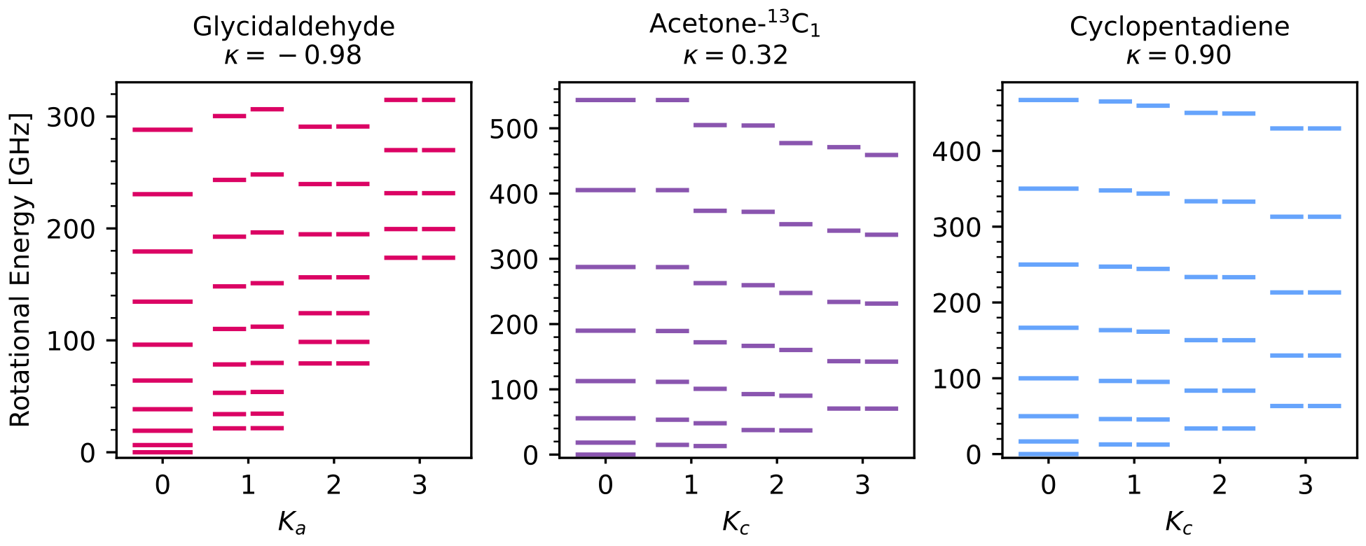 The figure shows the energy term diagrams for three molecules with different values of $\kappa$ (ordered from left to right by increasing values of $\kappa$). On the left hand side, glycidaldehyde with $\kappa = -0.98$ is close to the prolate limit for which reason $K_a$ is given on the $x$-axis. Accordingly, its energy term diagram matches qualitatively the prolate symmetric top energy term diagram (see previous chapter). Differences are, that for each pair of $J$ and $K_a$ values, two levels exist for the asymmetric top as $K_a$ is no longer a good quantum number and levels with both $J+1=K_a + K_c$ and $J=K_a + K_c$ are possible, and that the energy offset with $K_a$ is much more pronounced than for the simulated symmetric top in the previous chapter. The splitting between the asymmetry components (levels with same $J$ and $K_{a}$ value but different values of $J - K_a - K_c$) increases with $J$ but decreases with $K_a$. For low $J$ values, levels with the same $J$ and $K_a$ values are paired in energy (so-called prolate pairing) whereas at high $J$ values energy levels with same $J$ and $K_c$ values are paired in energy (so-called oblate pairing). On the right hand side, the energy term diagram of cyclopentadiene is shown, which is quite close to the oblate limit ($\kappa = 0.90$) for which reason $K_c$ is given on the $x$-axis. The qualitative agreement with the oblate symmetric top energy term diagram (see previous chapter) is very high. The asymmetry splitting increases with $J$ and decreases with $K_c$, similar to glycidaldehyde just that $K_a$ and $K_c$ are exchanged. Thus, also the pairing is inverted, going from oblate pairing for low $J$ values to prolate pairing for high $J$ values. Acetone-$^{13}$C$_1$ is quite asymmetric ($\kappa = 0.32$) which is also resembled by the strong asymmetry splitting in its energy term diagram.